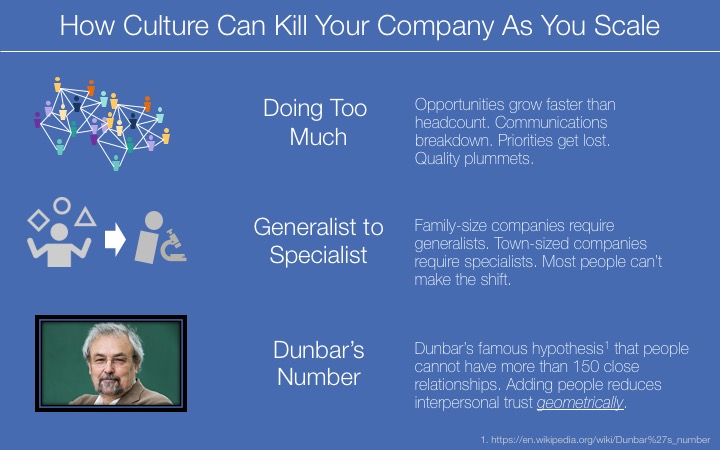 - Common reasons why startups can culturally implode: Too much stuff, generalist to specialist, Dunbar’s number.
